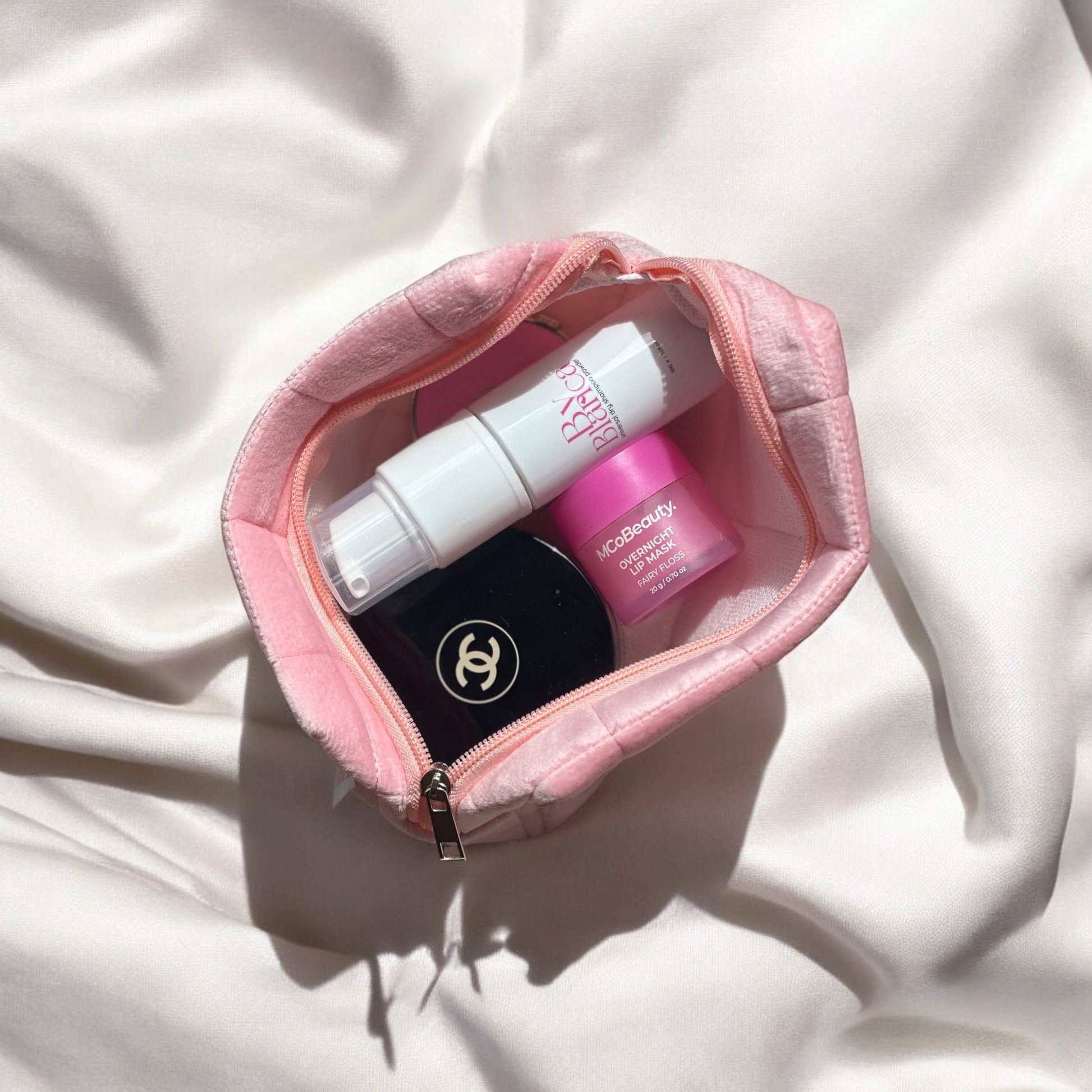 Our Beautiful pink, soft to the touch cosmetic bag will fit all your favourite products, including our dry shampoos and blender brush <3